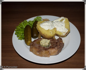 Kartoffeln kochen bis sie gar sind. Die Steaks kurz kalt abwaschen, abtrocknen, den Fettrand in geringen Abständen bis zum Fleisch einschneiden. Das Fett in einer Pfanne erhitzen und die Steaks hineinlegen. Öfter wenden, wobei jede Seite etwa 3 Minuten braten sollte – je nach gewünschtem Zustand. Danach die Steaks in Alufolie einwickeln und noch 15 Minuten im auf 50 Grand vorgeheiztem Backofen ruhen lassen. Danach die Steaks mit den Kartoffeln, dem Kräuterquark und den sauren Gurken servieren.