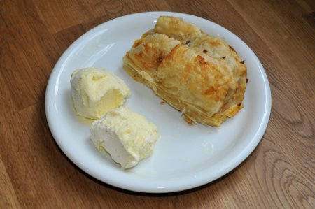 Die Sahne mit dem Ei verrühren und über den Strudeln verteilen. Im vorgeheizten Backofen bei 180°C ca. 30 Min mit Deckel, dann nochmal ca. 25 Min ohne Deckel backen, bis der Strudel goldbraun ist.