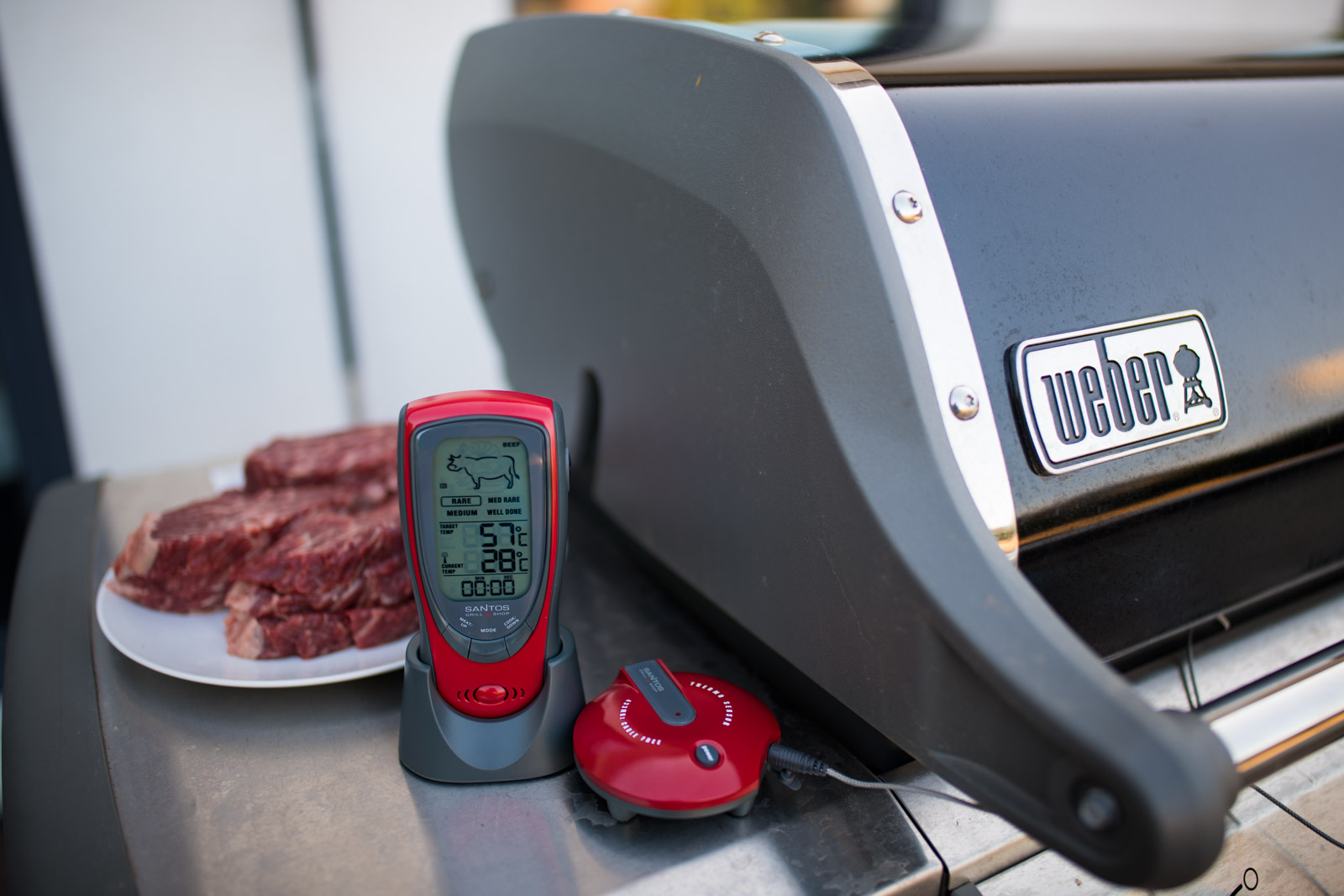 Nachdem ich mir über die für mich wichtigen Eigenschaften klar war, habe ich mir von Freunden einige Grillthermometer ausgeliehen und getestet. Von allen Grillthermometern die ich mir angeschaut und getestet habe entsprach das „BBQ Thermometer Funk Grill“ von der Firma „Santos Grills“ am ersten meinen Wünschen. Deshalb habe ich es mir jetzt selber gekauft. Es ist zwar etwas teurer, aber noch lange nicht so teuer wie das Weber iGrill.