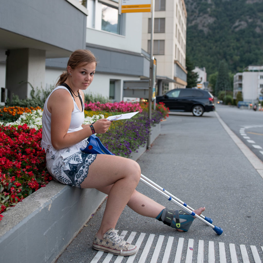 In Raron stolpert Clara, als Sie aus dem Wohnwagen kommt und knickt mit dem Fuß ganz böse um. Der Fuß wir schnell sehr dick und schmerzt stark. Wir fahren in die nächste Klinik und es stellt sich heraus, dass durch das Umknicken die Bänder im Fuß angerissen sind. Clara bekommt Krücken und eine Schiene.
