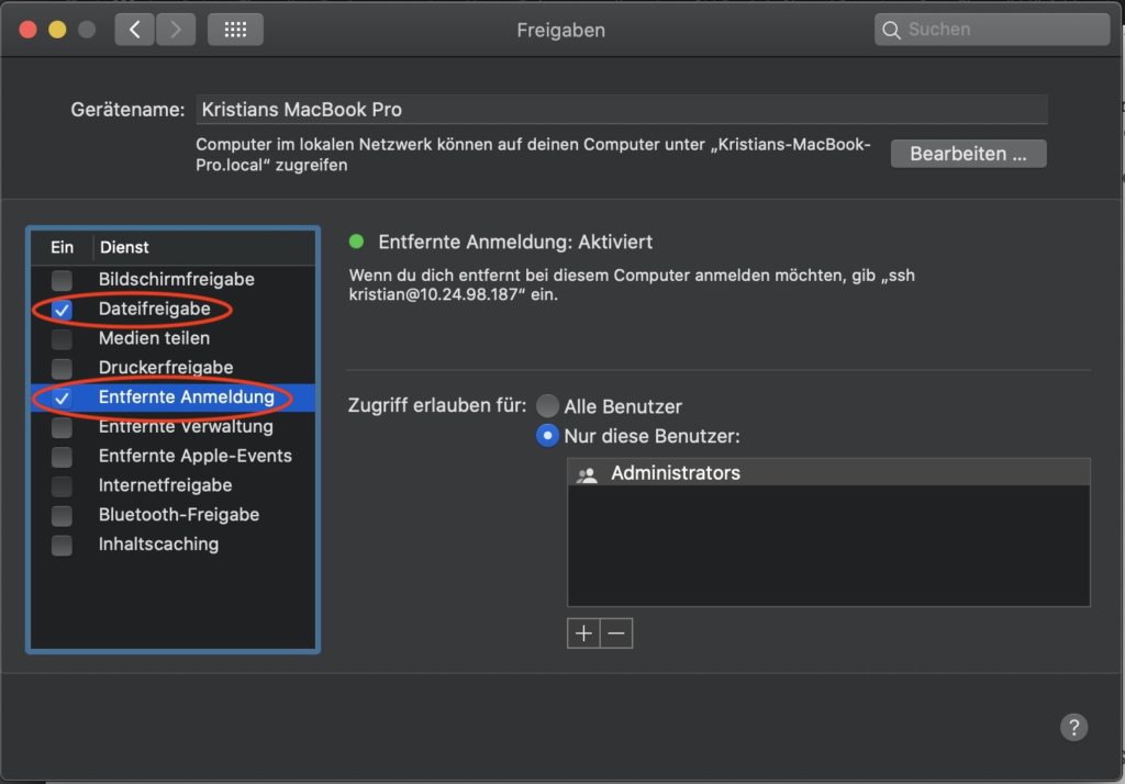 Damit das Gerät von Cisco die Datei von dem Rechner mit macOS runterladen kann, muss die „Dateifreigabe“ und die „Entfernte Anmeldung“ aktiviert sein. Diese findet man in den Systemeinstellungen und Freigaben.