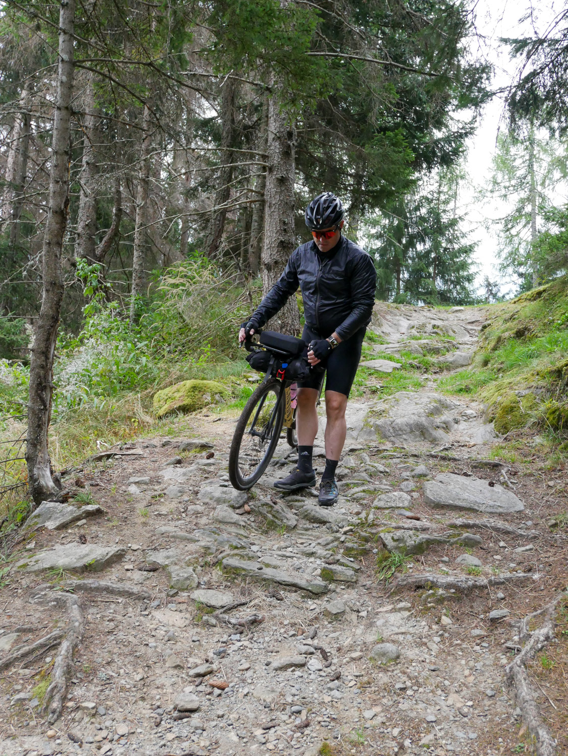 Da wir es ja ein bisschen ruhiger lieben und graveln wollen, fahren Jan und ich jetzt nicht die Passstraße runter, sondern noch mal 100 Meter auf einem kleinen Wirtschaftsweg auf den Berg. Von dort geht es über Gravelpiste runter ins Tal. Dabei stoßen wir immer wieder auf Passagen, die so steil sind, dass man absteigen und schieben muss. Auch runterfahren geht so nicht wirklich schnell.