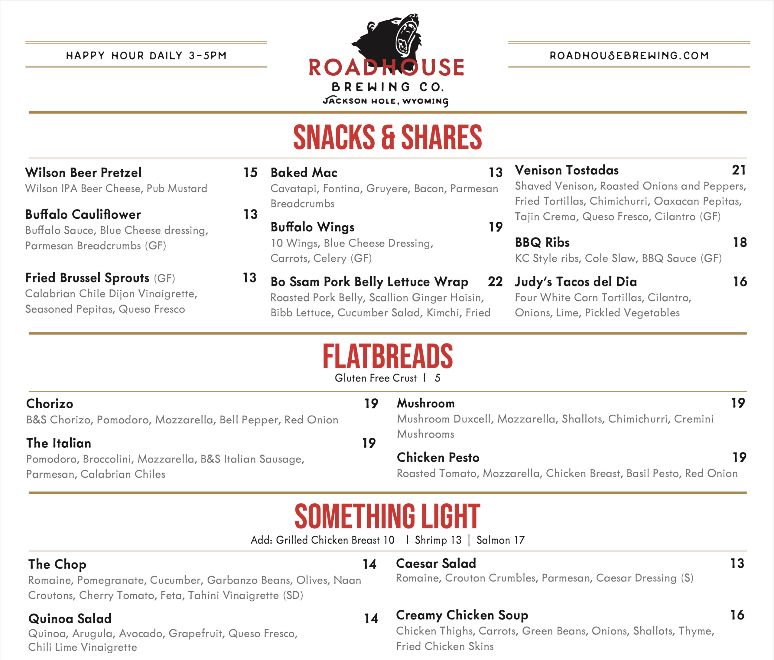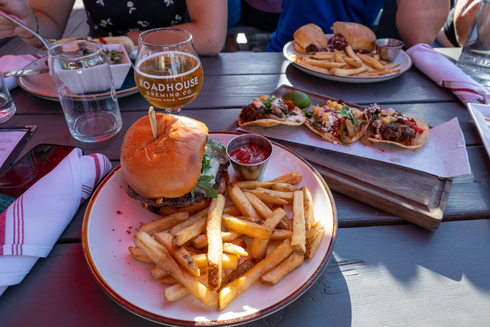 Nach dem wir ein paar örtlichen Geschäfte durchforstet haben sind wir hungrig. Wir laufen durch den Stadtpark mit den Toren aus Geweihen und vorbei an der Postkutsche zur Roadhouse Brewing Corporation, einem lokalen Restaurant mit eigener Brauerei. Dort wollen wir ein paar lokale Spezialitäten und das selbst geraute Bier probieren.