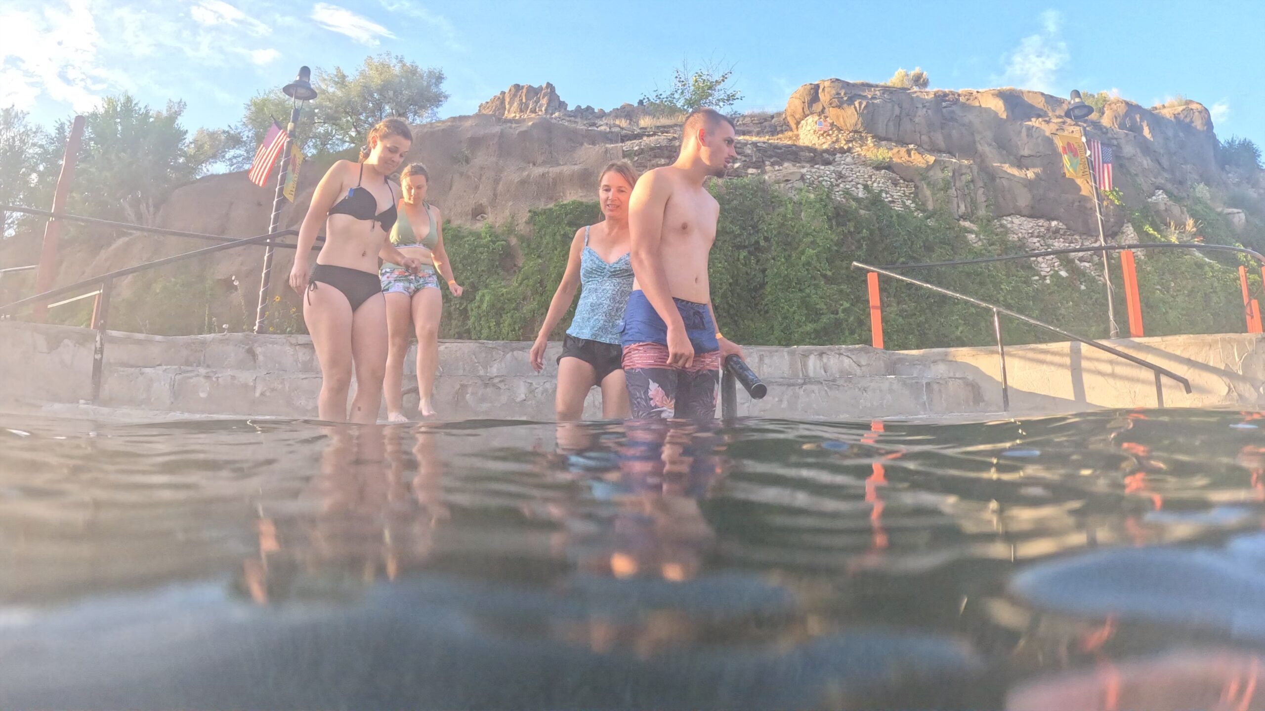 Am Ende des Tages um 19:00 Uhr setzen wir uns dann noch mal in die Famous Hot Springs von Lava Hot Springs. Die sind mit über 40 Grad tatsächlich sehr heiß und die Locals erzählen uns, dass wir Glück haben. Normalerweise sind hier über 40 Grad und dann ist es echt anstrengend sich auch noch in warmes Wasser zu setzen. Heute gab es aber ein kräftiges Gewitter deshalb ist es auf unter 30 Grad abgekühlt. Da machen die heißen Quellen wirklich Spaß.