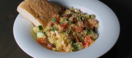Zutaten:500 g Couscous, 1 Paprikaschote (rot), 2 Fleischtomaten, 1/2 Gurke, 200 g Schafskäse, 2 Zehen Knoblauch, 1 Zwiebel (rot), 1 Zitrone, 2 EL Zitronensaft, 2 EL Balsamico, Olivenöl, Wasser, Petersilie, Salz, Pfeffer, Koriander, Pinienkerne und Mandeln. Zu dem Salat passt außerdem sehr gut ein Fladenbrot oder Foccatia. Zubereitung:Etwa 100 ml Olivenöl und 150 ml Wasser…
