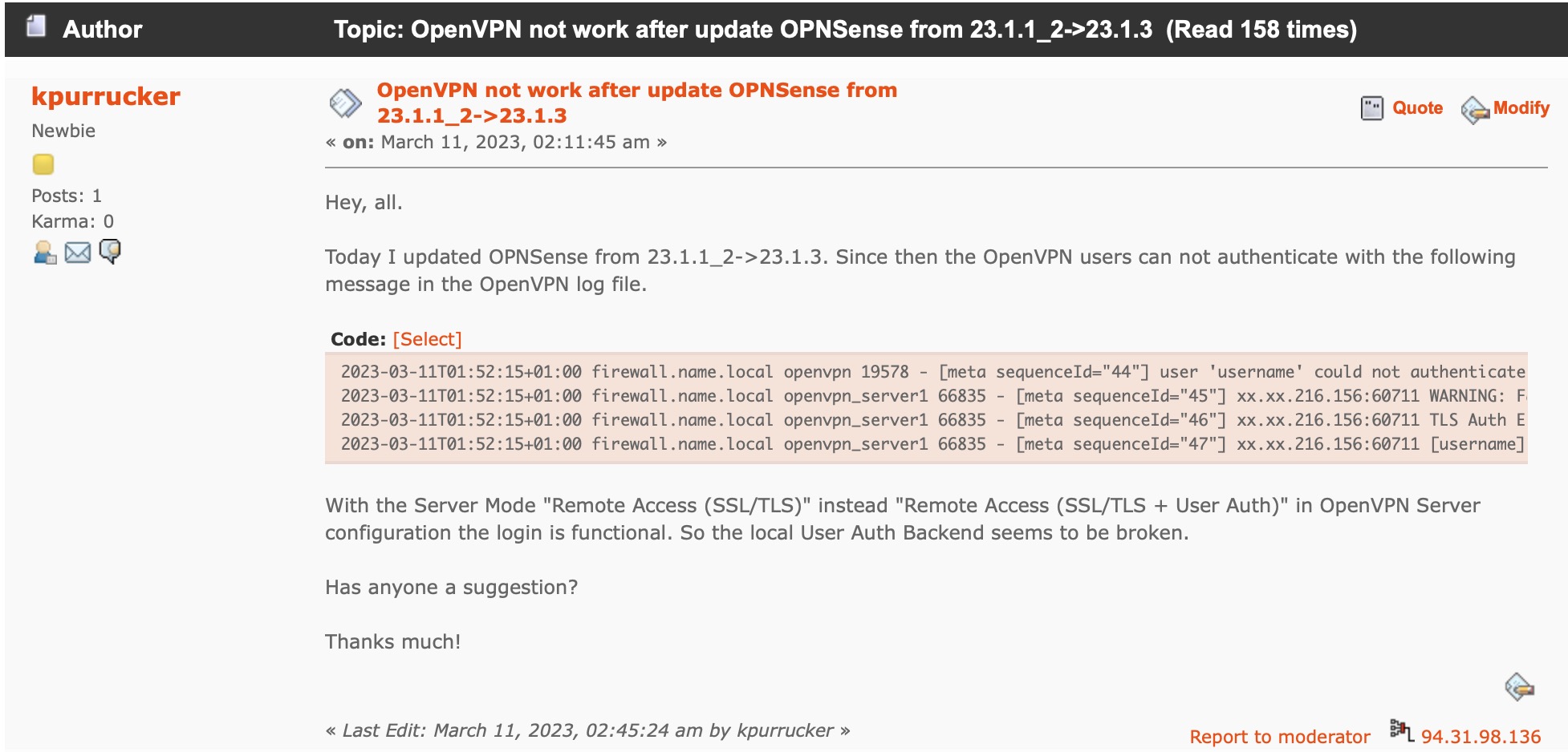 Eigentlich wollte ich am Freitag Abend nur noch mal schnell die Sicherheitsupdate auf allen von mir verantworteten OPNsense Firewalls einspielen. Und es war noch nicht mal Freitag der 13., sondern Freitag der 10.03.2023. Außerdem schien das kleine erschienene Update mit der Versionsnummer 23.1.3 laut Release Tag nur 6 Änderungen zu beinhalten. Doch leider dauerte das…